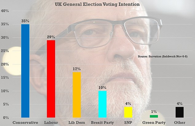 The Liberal Democrats were on 15 per cent and the Brexit Party behind with nine per cent.