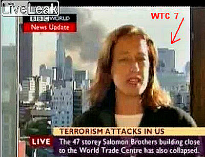 Above, we see the BBC's Jane Standley, who is standing in front of the clearly visible WTC7 tower.