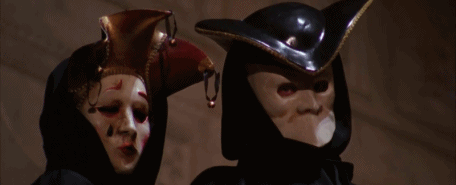 Domino (the hooker) has 'masks' hanging on her bedroom wall. This is an incredibly complex film, that is seemingly bedded in a type of cyclical dream logic...based on Traumnovelle (Dream Story)