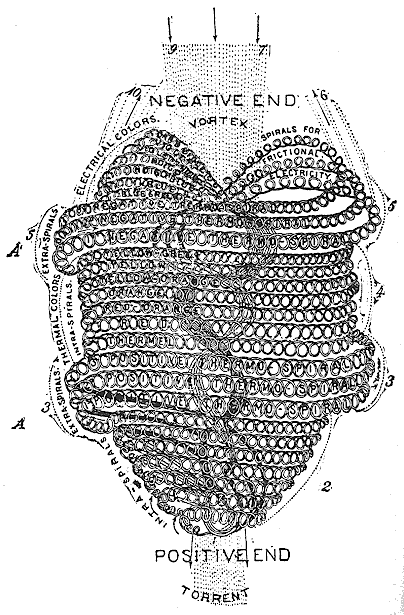 Fig. 135. The general Form of an Atom, including the spirals and 1st Spirillae, together with influx and efflux ethers, represented by dots, which pass through these spirillae. The 2nd and 3rd spirillae with their still finer ethers are not shown. - Edwin D. Babbitt, Principles of Light and Color, New York, 1878. |