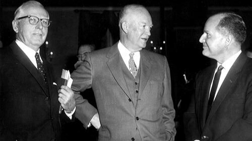 According to Kruse, three important movements in the 1940s and early 1950s—the prayer breakfast meetings of Abraham Vereide, Graham’s evangelical revivals, and the presidential campaign of Dwight D. Eisenhower—encouraged the spread of public prayer as a political development. According to Kruse, “Working in lockstep to advance Christian libertarianism, these three movements effectively harnessed Cold War anxieties for an already established campaign against the New Deal.”[112]