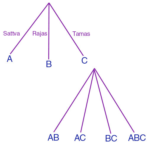 Thus if we have A, B and C these can only combine as AB, AC, BC and ABC. The higher triplicity, 3, and the lower quaternary, 4, make 7. It is thus that mathematically and by a further stage of densification spirit descends into form and the number 7 is manifested, bringing the important sevenfold divisions in colour and sound and giving us the seven levels of consciousness in man (that is the seven chakras) with which we are now concerned.